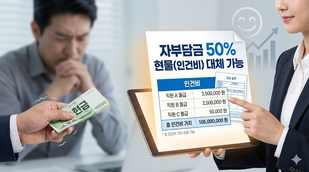 자부담금의 50%까지는 대표님이나 직원의 '인건비(작년 연봉)'로 대체할 수 있습니다. 즉, 실제로 통장에 넣어야 할 현금은 절반으로 줄어듭니다. 이 규정을 몰라서 포기하는 분들이 너무 많습니다. 전문가와 상의하면 자금 부담을 확 줄이는 설계가 가능합니다.