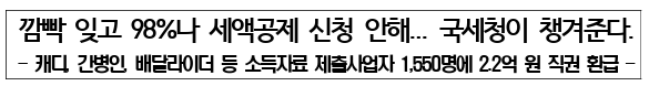 - 이에 국세청은 「용역제공자에 관한 과세자료의 제출에 대한 세액공제」 제도가 사업장 제공자 등의 성실한 납세협력 이행에 대한 보상이라는 당초 취지를 감안하여 세액공제 요건이 됨에도 신청하지 않은 사업자 1,550명에게 2.2억 원의 법인세・소득세를 직권으로 환급하여 주기로 하였습니다