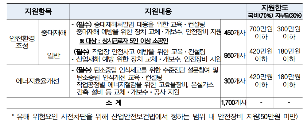 - * 안전환경조성 1,400개사(중대재해 450개사, 일반 950개사) 내외, 에너지효율개선 300개사 내외 (단, 중대재해 450개 사는 상시근로자 5인 이상 소공인만 지원 가능)
