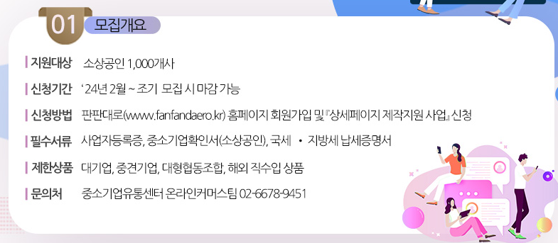 이상으로 오늘은 2024년 소상공인 온라인 채널 진출을 위해 중소벤처기업부 판판대로에서 지원하는 소상공인 상세페이지 제작지원사업에 대해서 안내해드렸습니다. 조속히 신청하셔서 혜택을 받으시기 바랍니다.