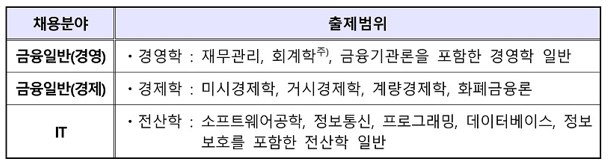 - 금융일반(경영)·금융일반(경제).IT 분야는 입사지원서를 바탕으로 채용분야별 교육사항, 자격사항, 경력사항에 대한 NCS기반 직무 능력 검증 실시
