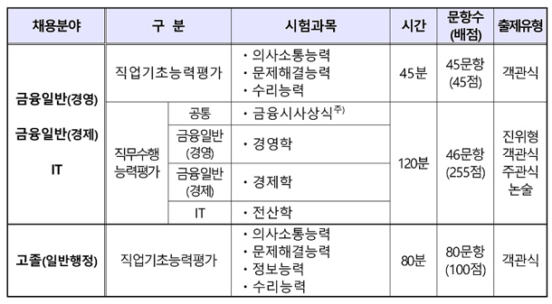 - 금융일반(경영)·금융일반(경제).IT 분야는 입사지원서를 바탕으로 채용분야별 교육사항, 자격사항, 경력사항에 대한 NCS기반 직무 능력 검증 실시