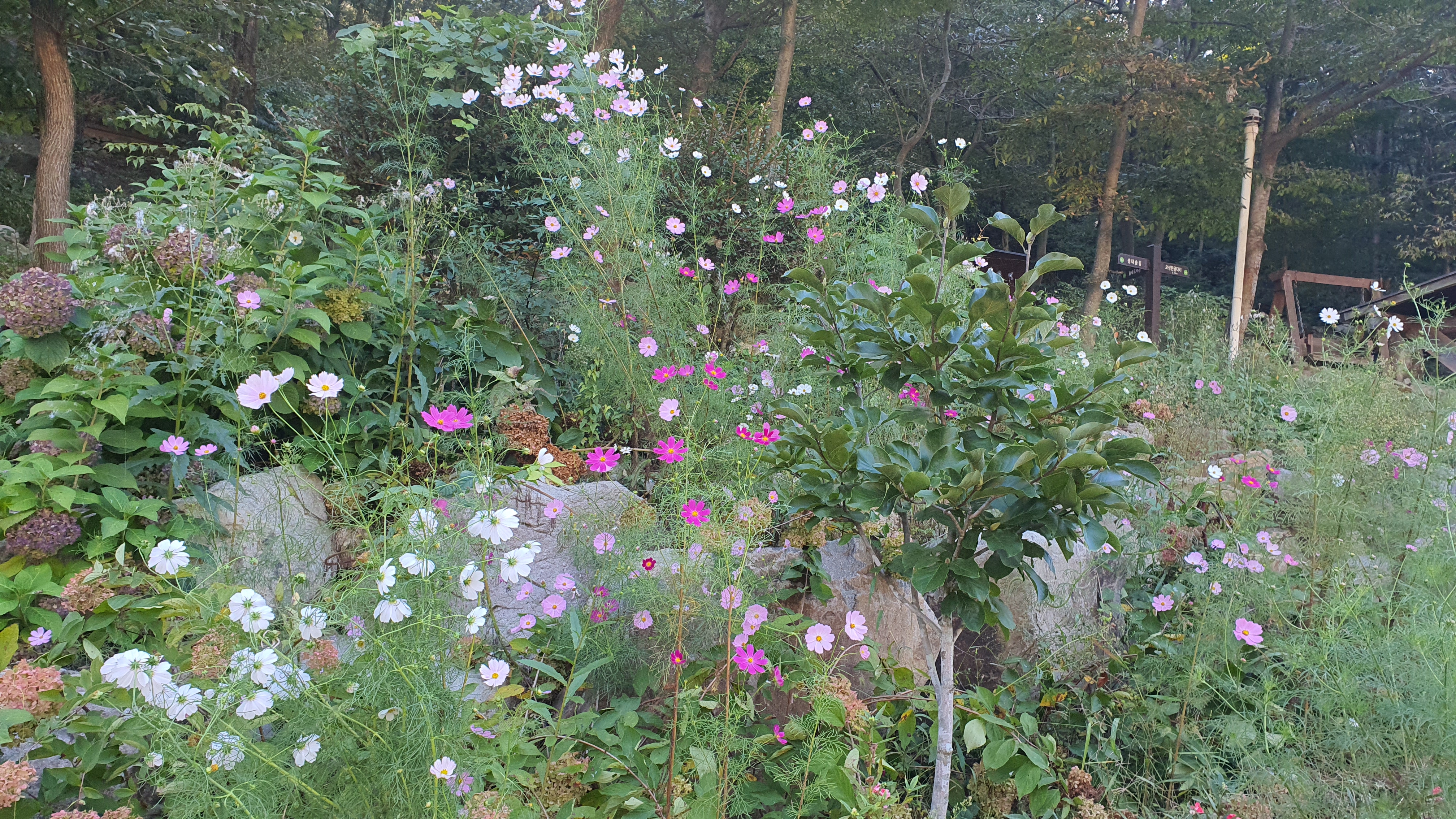 정원 주변에 가을을 상징하는 코스모스가 아름답게 피어있고 앞쪽 산등성이를 따라가면 둘레길 시리즈를 경험할 수 있습니다.
