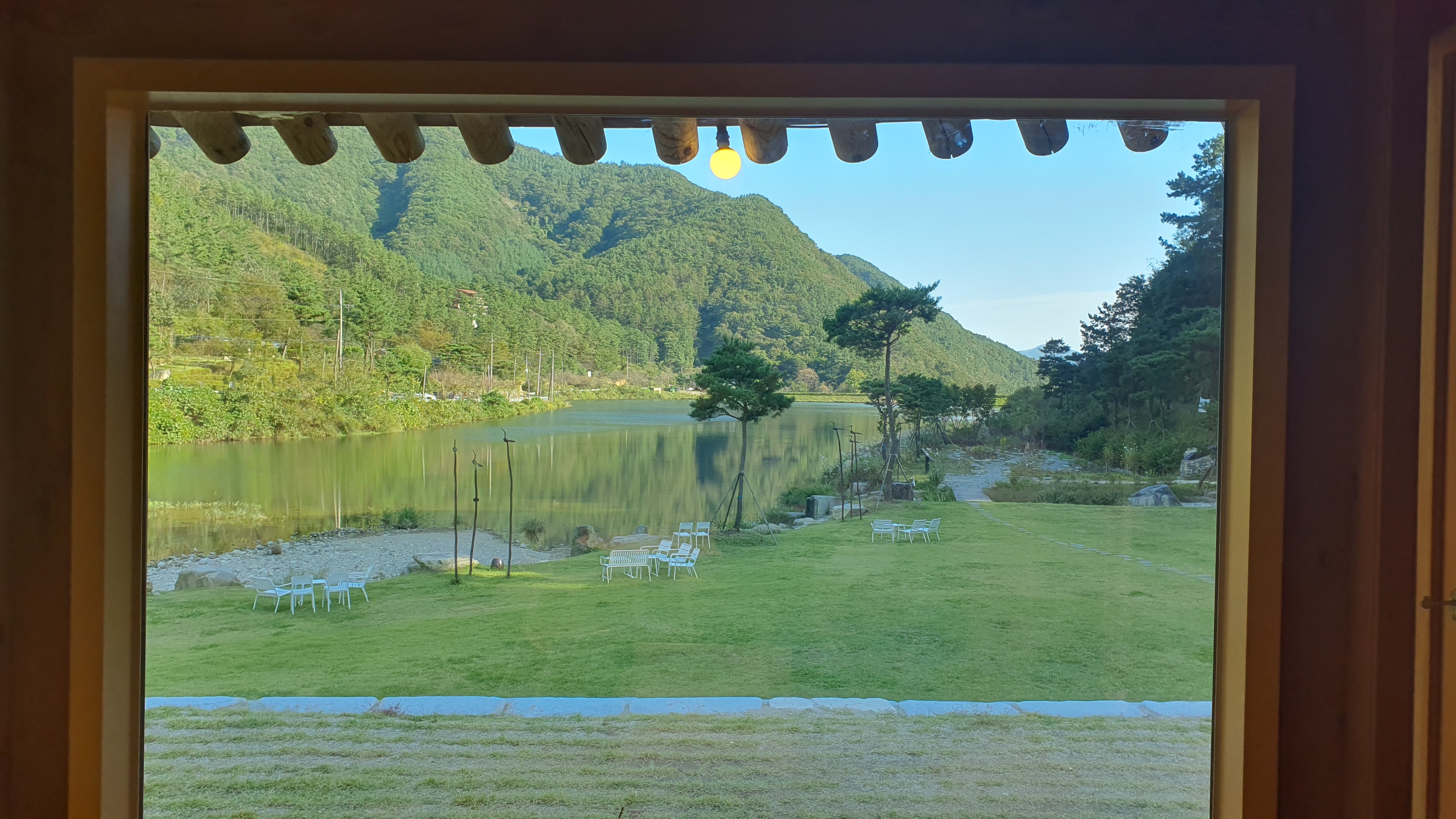 통창 너머로 아름다운 저수지와 잘 어우러진 야외 잔디마당이 눈을 시원하게 합니다.