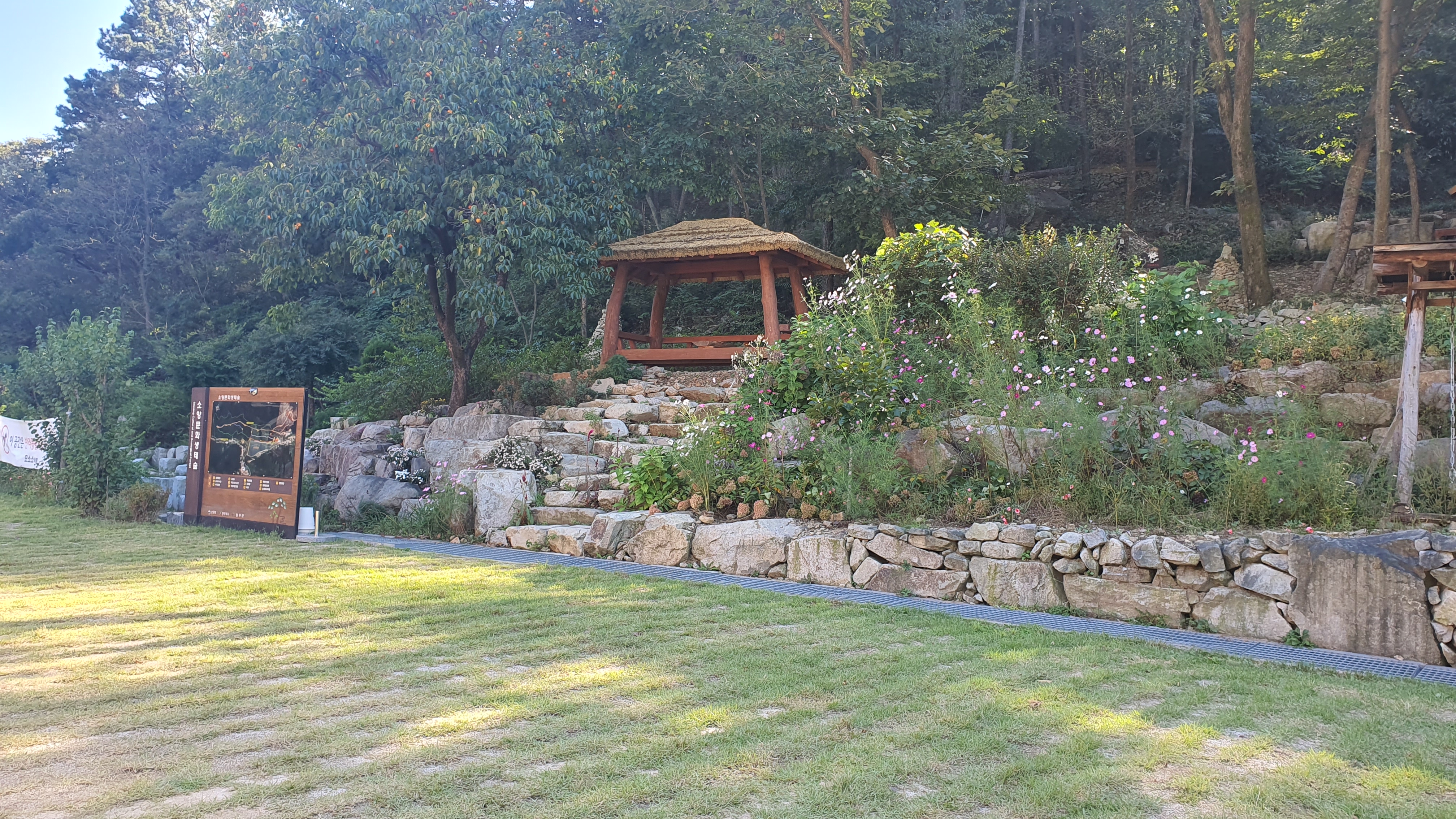 정원 주변에 가을을 상징하는 코스모스가 아름답게 피어있고 앞쪽 산등성이를 따라가면 둘레길 시리즈를 경험할 수 있습니다.