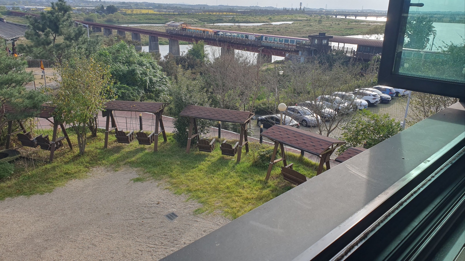통창 너머로 비비정 정자와 구철교, 예술열차가 보입니다.