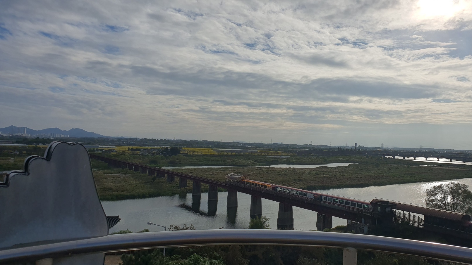 통창 너머로 비비정 정자와 구철교, 예술열차가 보입니다.