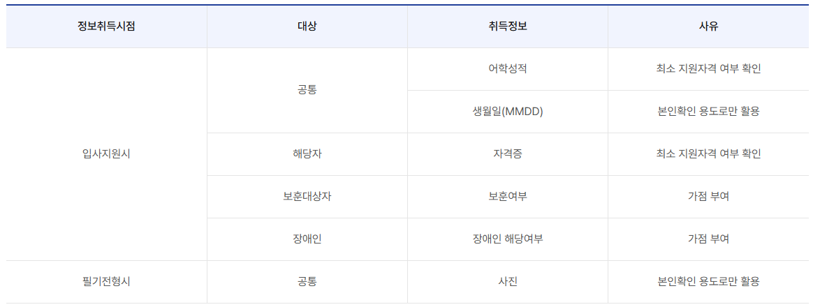 - 채용단계별 취득정보는 아래와 같은 사유로 요구하고 있음