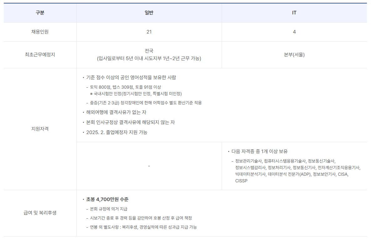 - 기간 : 최종합격자 발표일로부터 신입사원 교육 종료 시까지 결원이 발생한 경우 예비합격자 순위에 의거 임용 (※ 예비합격자 별도 안내 예정)