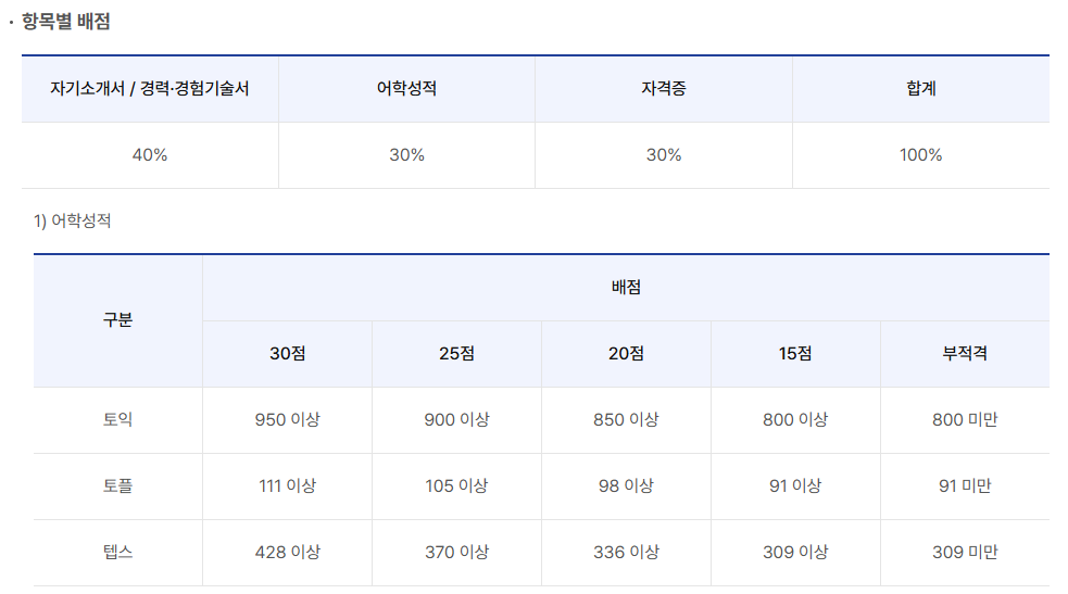 - 동점자 처리순서 : 보훈 > 장애인 > 배점 30점 해당 자격증 소지자 > 배점 25점 해당 자격증 소지자 > 어학성적 우수자