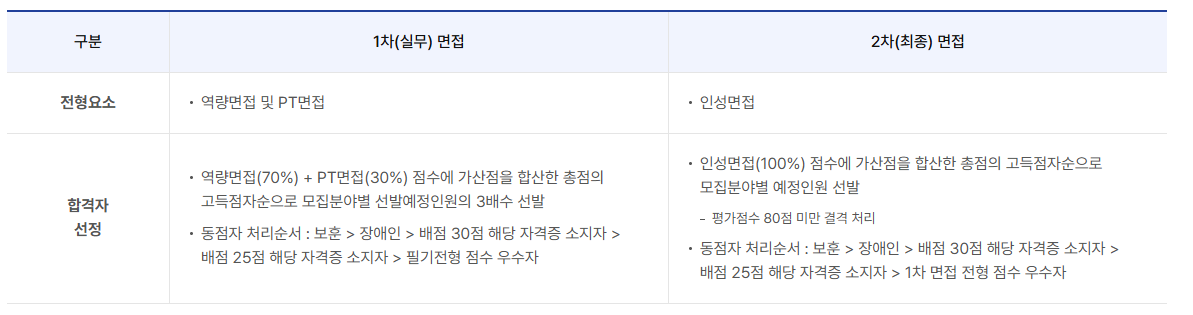 - 동점자 처리순서 : 보훈 > 장애인 > 배점 30점 해당 자격증 소지자 > 배점 25점 해당 자격증 소지자 > 서류전형 점수 우수자