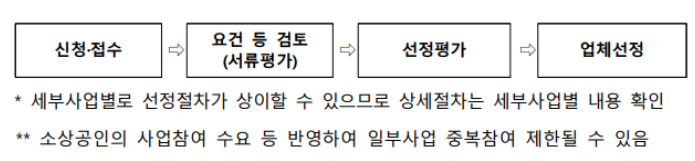 - 신청 및 접수 -> 요건 등 검토 -> 선정 평가 -> 업체 선정.