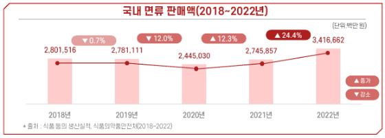 - 2022년 기준 국내 면류 판매액은 전년대비 24.4% 증가한 3조 4,166억 원 기록