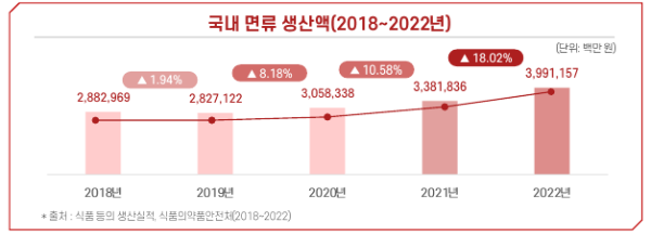 - 2022년 기준 국내 면류 생산규모는 3조 9,911억 원으로, 2018년 이후 연평균 8.5% 증가함