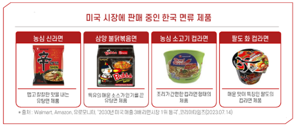 - 2023년 면류 수출액 역대 최대 기록, 라면 1조 2,500억 원(9억 5,200만 달러) 수출 달성함