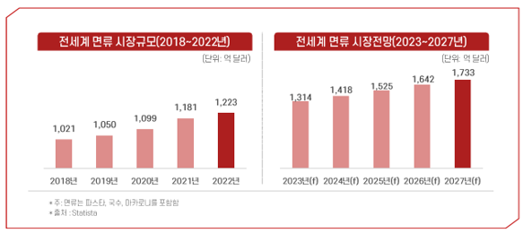 - 세계 면류 시장규모는 2022년 기준 1,223억 달러로 2018년 대비 19.8% 증가함