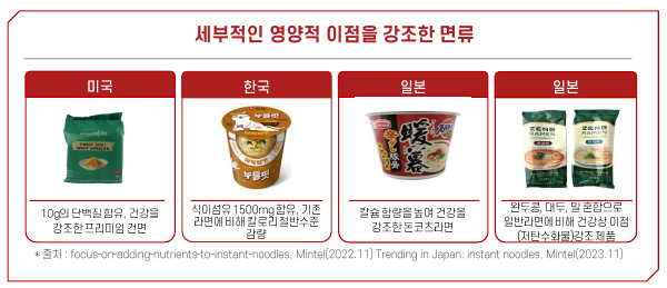 - 고단백질, 저칼로리, 고칼슘, 저탄수화물 등 영양적 이점을 강조한 면류 식품 인기