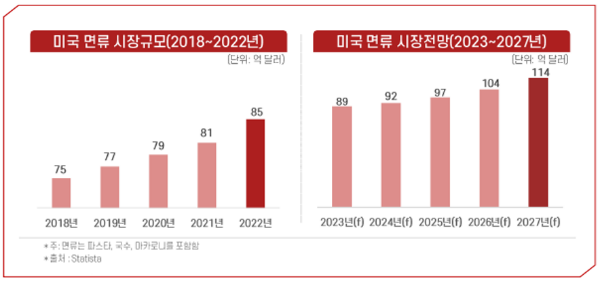 - 미국 면류 시장규모는 2022년 기준 85억 달러로 2018년 대비 13.3% 증가하였으며 2023년 89억 달러에서 2027년 114억 달러까지 연평균 6.4% 증가할 것으로 전망됨