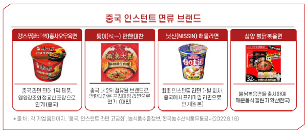- 2022년 기준으로 중국의 인스턴트 면류 소비량은 약 450억 7,000만 개로, 전 세계 국가 중 가장 많은 양을 소비한 것으로 나타남