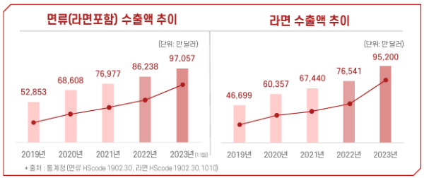 - 2023년 면류 수출액 역대 최대 기록, 라면 1조 2,500억 원(9억 5,200만 달러) 수출 달성함