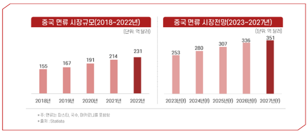 - 중국 면류 시장규모는 25022년 기준 231억 달러로 2018년 대비 49.0% 증가하였으며 2023년 253억 달러에서 2027년 351억 달러까지 연평균 8.5% 증가할 것으로 전망됨
