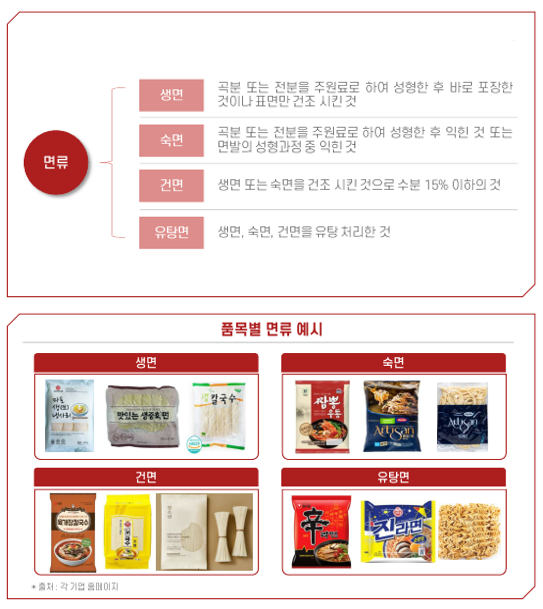 - 면류 정의: 곡분 또는 전분 등을 주원료로 하여 성형, 열처리. 건조 등을 한 것으로 생면, 숙면, 건면, 유탕면을 포함함 면류는 제조방식에 따라 생면, 숙면, 건면, 유탕면으로 분류됨(출처:식품공전)