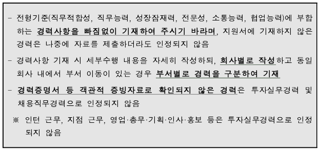 ▪ 지원자가 응시하려는 직급 및 분야에서 요구하는 투자실무경력 및 채용직무 경력 이상의 경력 기간 보유