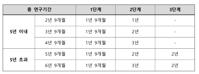- 연구기간이 2년 9개월 이상인 과제는 아래와 같이 단계를 구분하고, 1년 9개월 이하인 경우 1단계로만 구성