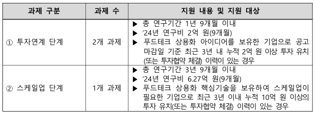 - 푸드테크 분야 투자연계 및 스케일업 단계의 경우 투자유치 여부 확인 후 최종 선정
