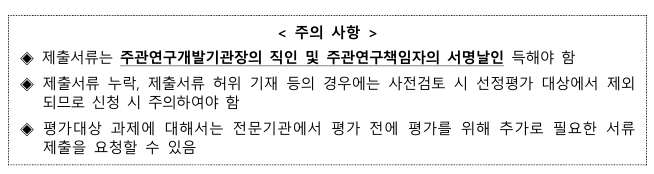 - 접수된 과제 수가 선정하고자 하는 과제의 5배수를 초과하거나 총 정부출연금 10억 원 이상의 주요 과제는 공개발표평가 전에 서면평가를 실시할 수 있음