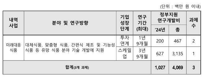 - 미래대응식품 내역사업에 해당하는 푸드테크 분야(붙임 1) 등 연구방향에 부합하는 과제 신청