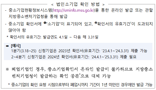 - 개인사업자와 법인소기업의 신청방법 및 제출서류 상이
