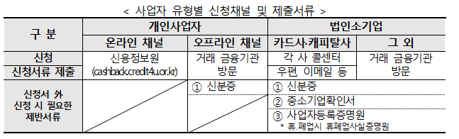 - * 사업자 유형에 따라 신청방법 상이 : 개인사업자(온·오프라인 中 택 1), 법인소기업(오프라인 신청)