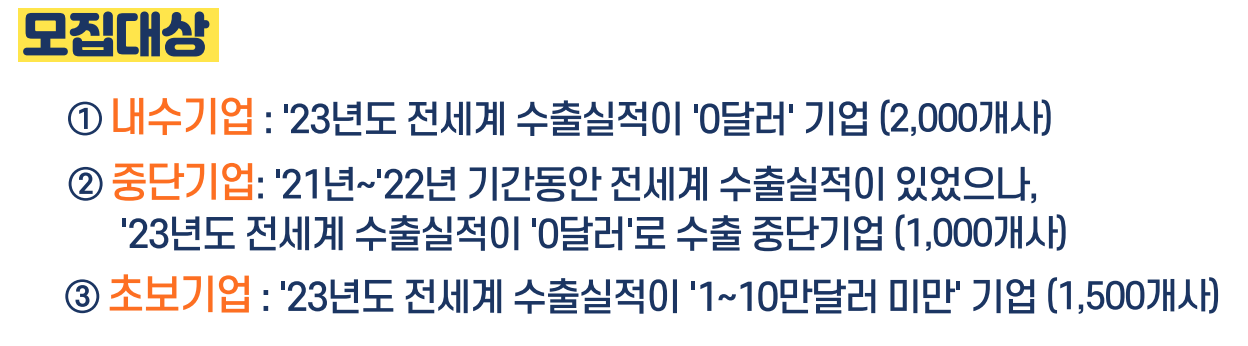 - ②전세계 수출실적이 1~10만달러인 초보기업 * 단, ‘23년 직수출액 10만달러 초과 기업의 경우, 내수기업 및 초보기업 선정이 완료된 이후 별도 「선정위원회」 심의를 거쳐 별도 선정될 예정
