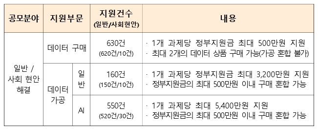 - 데이터· AI 활용을 통해 비즈니스 혁신 및 新 서비스·제품 창출이 필요한 기업에 바우처 형식의 데이터 구매‧가공서비스 지원