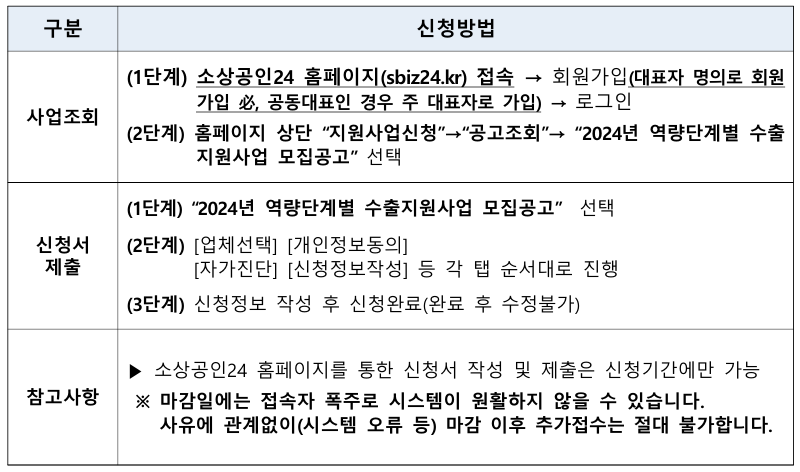 - 기타 자세한 내용은 아래 첨부된 2024년 역량단계별 수출지원사업 모집공고문을 다운로드하셔서 참고하시기 바랍니다.
