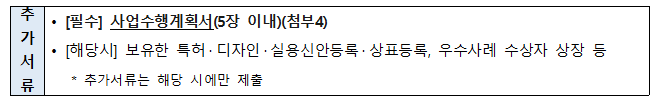 - (추가 서류) 기업가형 육성 컨설팅 신청 경우 또는 경영안정 컨설팅 자부담 무료 조건 해당 경우 아래의 추가 서류 제출