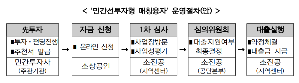 - 민간투자사의 先투자·펀딩 시 정책자금을 後매칭융자로 지원하여 성장을 추구하는 소상공인을 기업가형 소상공인으로 육성
