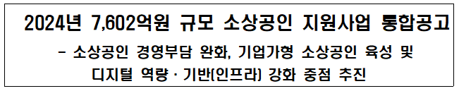 안녕하세요? 지난 1월 3일 중소벤처기업부(장관 오영주)는 3일 총 7,602억 원 규모의 「2024년 소상공인 지원사업 통합공고」를 실시한다고 밝혔는데요, 통합공고된 내용을 자세히 정리해 드리도록 하겠습니다.