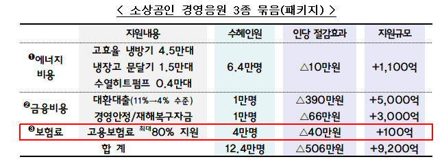- ‘소상공인 경영응원 3종 묶음(패키지)’에 포함된 ‘자영업자 고용보험료 지원(’ 23. 50억 원 → ‘24. 150억 원)’을 증액하는 등 특히 ‘경영부담 완화’ 부문의 예산을 중점적으로 확대한다.