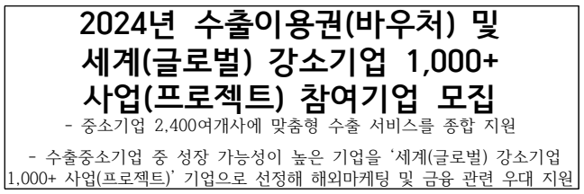 - 신청기간: 수출이용권(바우처)과 세계(글로벌) 강소기업 1,000+ 사업(프로젝트)에 참여를 희망하는 기업은 1월 23일부터 2월 13일까지