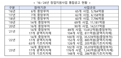 - (‘16) 중앙부처 창업지원사업 통합공고 실시(6개 기관, 65개 사업, 0.6조 원)조원)