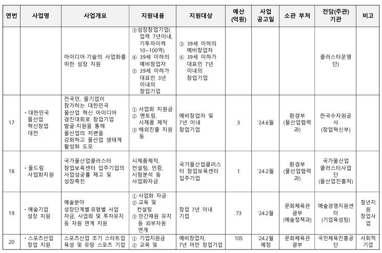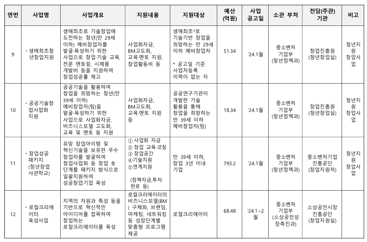 중소벤처기업부에서 공고된 2024년 중앙부처 및 지자체 창업지원사업 통합 공고내용을 정리해 드리겠습니다.