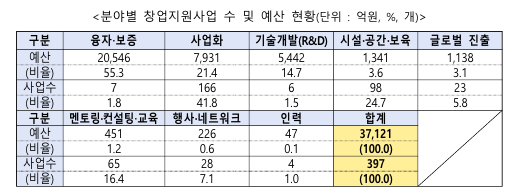* 사업화, 시설·공간·보육, 멘토링·컨설팅·교육, 행사·네트워크, 글로벌 진출, 융자·보증, 기술개발(R&D), 인력