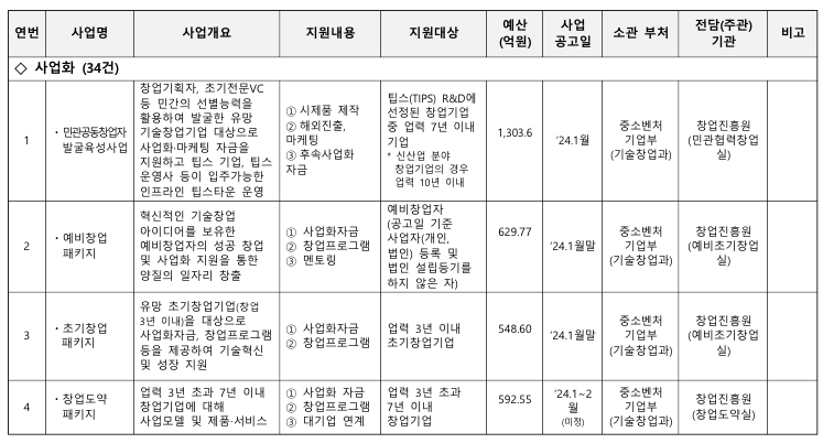 중소벤처기업부에서 공고된 2024년 중앙부처 및 지자체 창업지원사업 통합 공고내용을 정리해 드리겠습니다.
