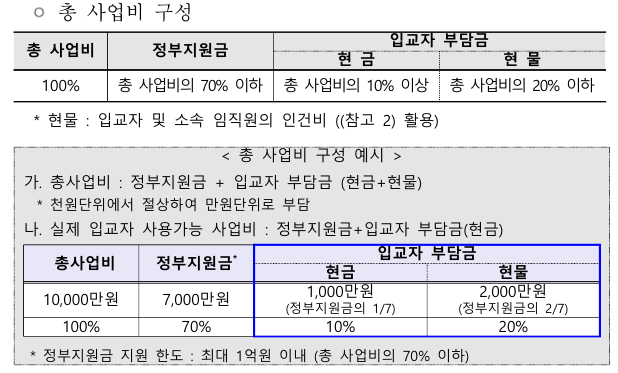 1) 정부지원금 지원한도 총 1억 원 이내(총사업비의 70% 이하)