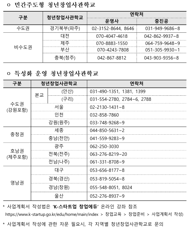 - 신청 관련 문의처는 입교 희망 청년창업사관학교로 확인하시기 바랍니다.
