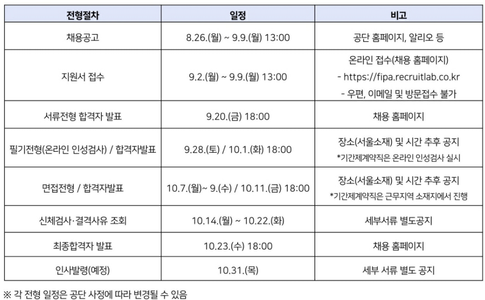 - 접수방법: 한국어촌어항공단 채용홈페이지(https://fipa.recuritlab.co.kr)에서 온라인 접수