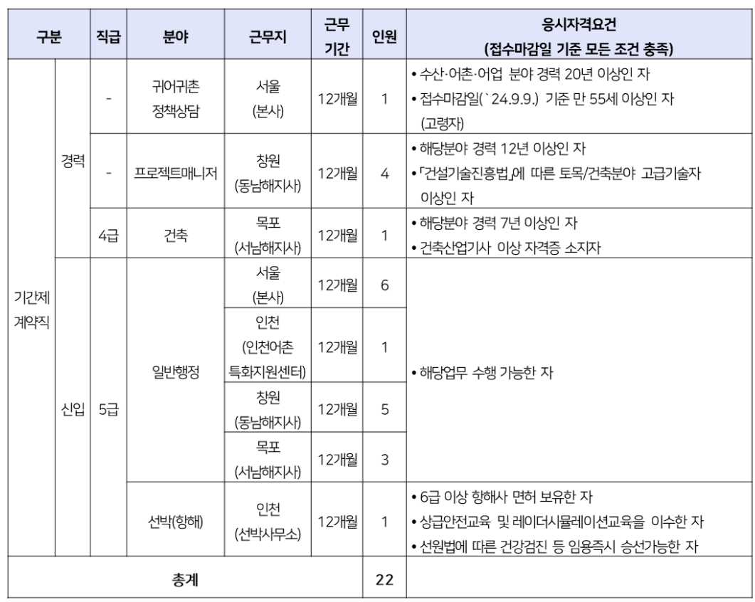 한국어촌어항공단에서 공고된 2024년 하반기어촌어항공단 직원 공개채용공고 내용을 정리해 드리겠습니다.