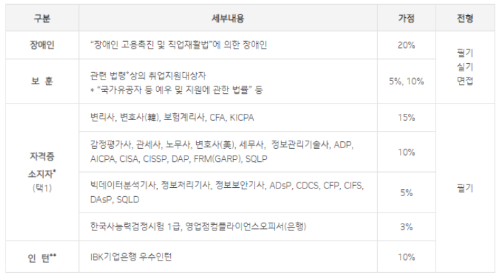 - 입행지원서 上 우대사항을 선택한 지원자에 한해 가점이 적용되며, 서류 제출기한(10월 초·중순 예정) 內 미제출 또는 오류 제출 시 적용 불가